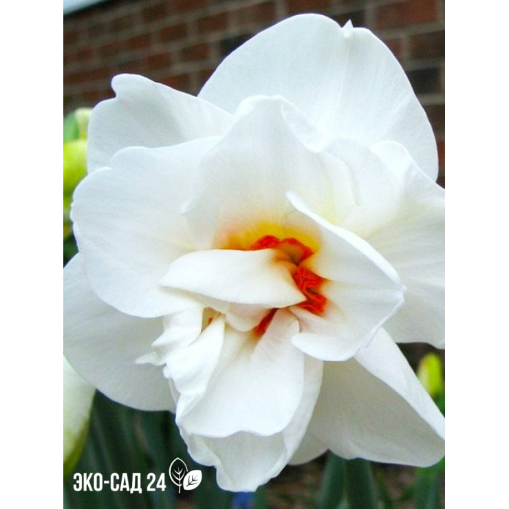 Нарцисс Acropolis (Double-flowered narcissus 'Acropolis'). Экзотический внешний вид и пряный аромат этого сорта вскружит голову! Чисто белые или кремовые махровые цветки с пятнами оранжево-красного цвета в центре – так выглядит этот нарцисс. Это один из лучших среднецветущих сортов, который относится к группе Махровые нарциссы. Он вырастает до 35-60 см в высоту и до 10-20 см в ширину. Его цветки крупного размера. Они полностью махровые: имеют дополнительные лепестки (доли околоцветника) или махровую коронку.Размер цветка 10-12 см в диаметре.Цветки душисты – источают пряный тропический аромат. Листья сине-зеленого цвета.