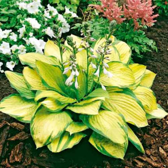 Фантазия и палитра красок у природы практически безграничны. Живым доказательством этому служит хоста Блю Энджел. Заказав корневища этой культуры на нашем сайте, вы получите крупный кустарник высотой и диаметром до 80-110 см. Поверхность огромных листьев длиной 40 см – жатая, а окраска – пастельная, голубо-зеленая. Стройные соцветия распускаются в июле-августе, цветоносы в это время усыпаны бледно-сиреневыми бутонами.