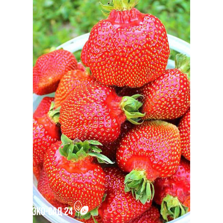 Ягоды клубники красивого бордово-алого цвета. Форма первых ягод гребневидная, немного приплюснутая. Товарные свойства высокие. Благодаря плотной мякоти урожай хорошо хранится и транспортируется. Куст крупный, но аккуратный, компактный. Листья большие, ярко-зеленые, на крепких черенках, устремлены вверх. Поэтому раскидистость куста средняя.